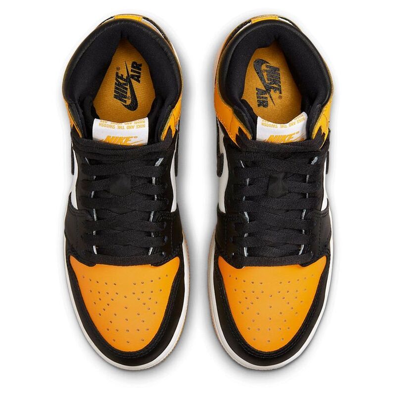 Featuring a standout color block from the 2018 ‘Bred Toe,’ these sneakers combine white leather panels with a Taxi yellow toe box and black accents. Nike Air branding and Wings logo adorn the design, while the rubber cupsole boasts a lightweight Air-sole heel unit.