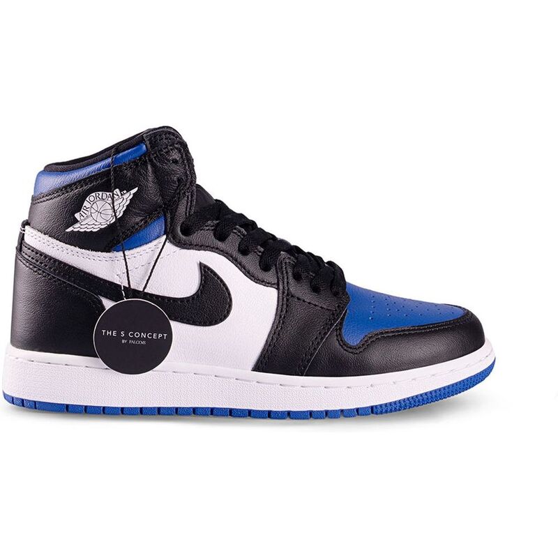 These sneakers are crafted from premium leather, featuring a crisp white base enhanced by striking black overlays and vibrant Game Royal accents. A softly padded black nylon tongue adorned with a Nike Air tongue tag complements the design, while the quintessential Jordan Wings logo adds a touch of heritage to this sophisticated ensemble.