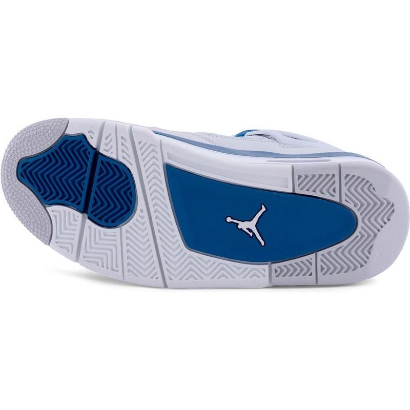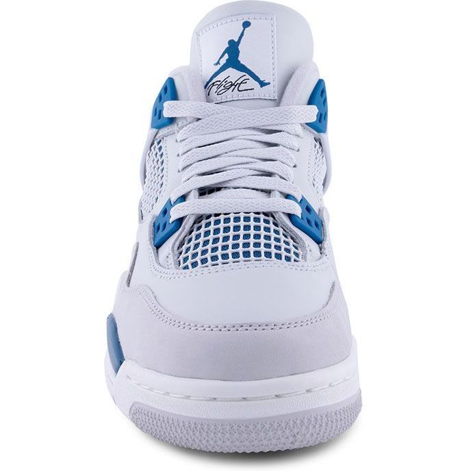 The Jordan 4 Retro Military Blue revives a cherished OG colorway of this iconic silhouette. Smooth off-white leather forms the upper with quarter panel netting and a tonal nubuck forefoot overlay. A striking blue Jumpman logo completes the unique design, matching the molded eyelets and a back tab adorned with Nike Air branding.
