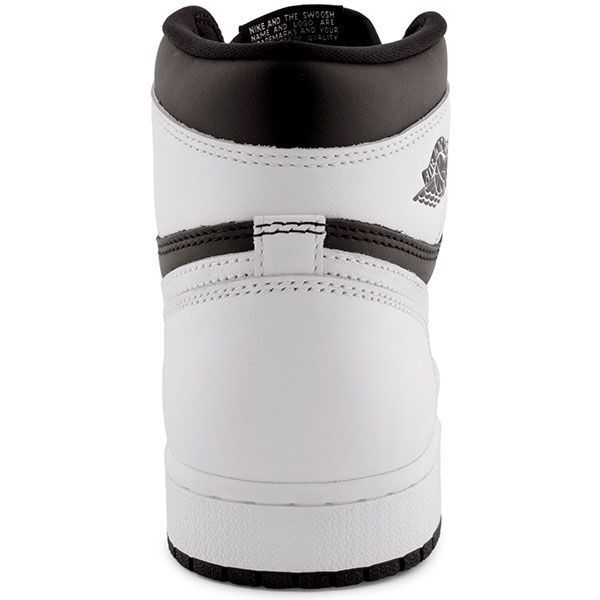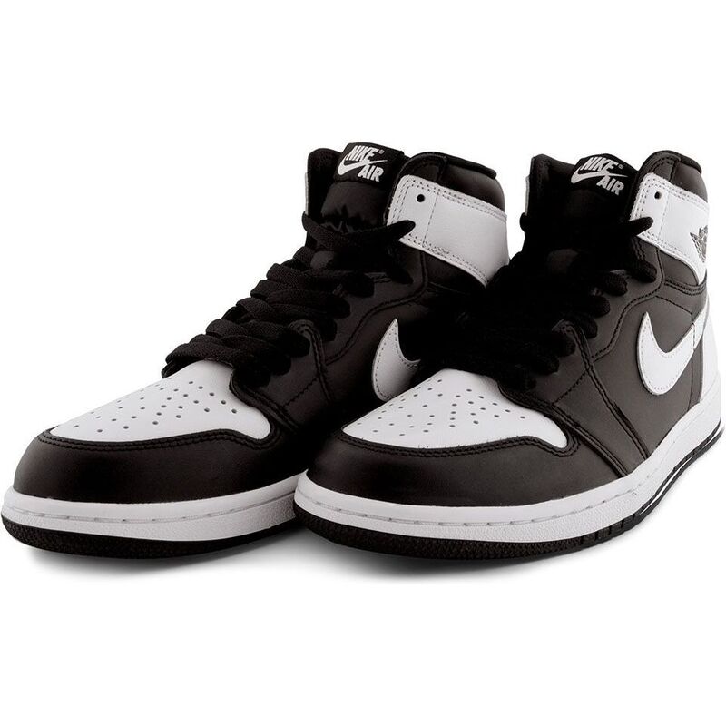These sneakers feature timeless 'Panda' color blocking in smooth leather. The black base is accented by white on the toe box, Swoosh, heel, and collar overlay, marked with a black Air Jordan Wings logo. A woven Nike Air tag adorns the design, while encapsulated Air-sole cushioning enhances the rubber cupsole with white sidewalls and a black outsole.