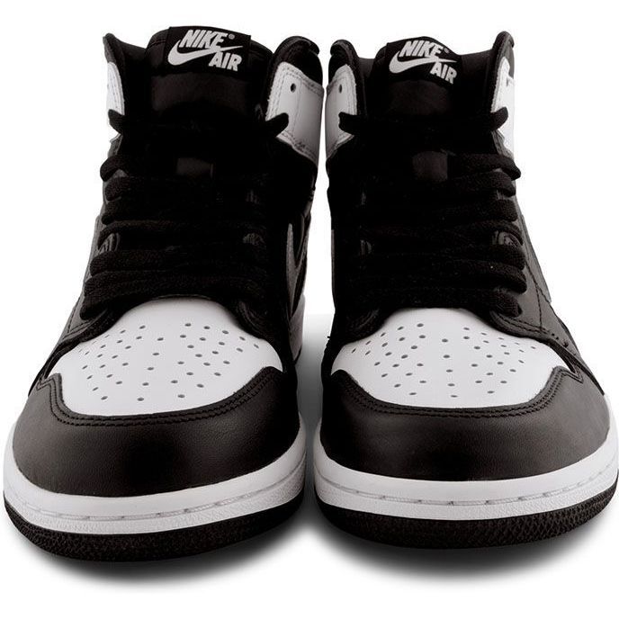 These sneakers feature timeless 'Panda' color blocking in smooth leather. The black base is accented by white on the toe box, Swoosh, heel, and collar overlay, marked with a black Air Jordan Wings logo. A woven Nike Air tag adorns the design, while encapsulated Air-sole cushioning enhances the rubber cupsole with white sidewalls and a black outsole.