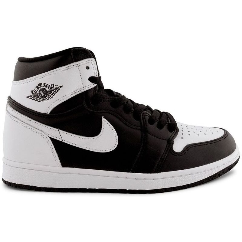 These sneakers feature timeless 'Panda' color blocking in smooth leather. The black base is accented by white on the toe box, Swoosh, heel, and collar overlay, marked with a black Air Jordan Wings logo. A woven Nike Air tag adorns the design, while encapsulated Air-sole cushioning enhances the rubber cupsole with white sidewalls and a black outsole.