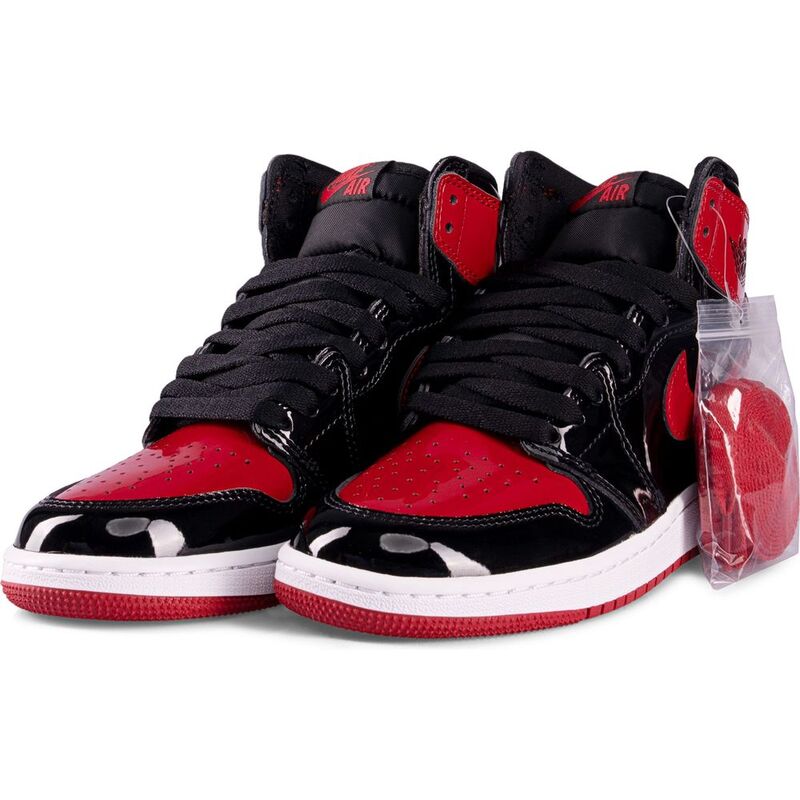 The Air Jordan 1 Retro High OG 'Patent Bred' elevates the legendary colorway with a lustrous twist. This version retains the quintessential design elements but introduces a sleek patent leather construction that captures the light with every step. The upper combines classic black paneling with bold Varsity Red accents on the toe box, Swoosh, heel overlay, and collar flap. A woven Nike tag graces the black nylon tongue, and the iconic Wings logo is prominently stamped on the lateral collar.