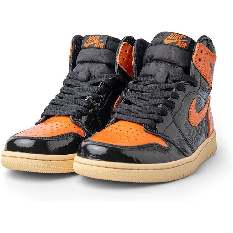 These sneakers revisit a striking colorway inspired by Michael Jordan’s iconic backboard-breaking dunk from a 1985 Nike exhibition game. Featuring black, Pale Vanilla, and Starfish, matching MJ's jersey, the crinkled patent leather upper pays homage to the broken glass of that legendary moment.