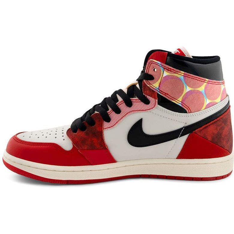 These sneakers reimagine the ‘Chicago’ colorway with a nod to 'Spider-Man: Across the Spider-Verse.’ They feature a white leather upper, black patent leather collar and Swoosh, and scarlet overlays with various textures. With Wings and Nike logos gracing the design, this high-top sits on a rubber cupsole with vintage sidewalls and a crimson semi-translucent outsole.