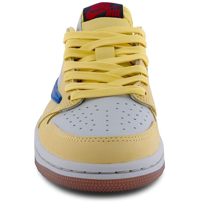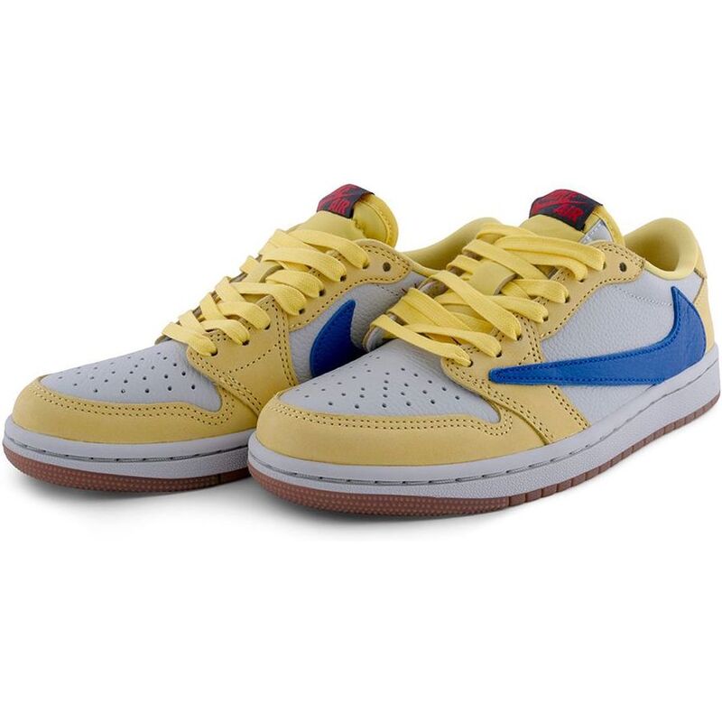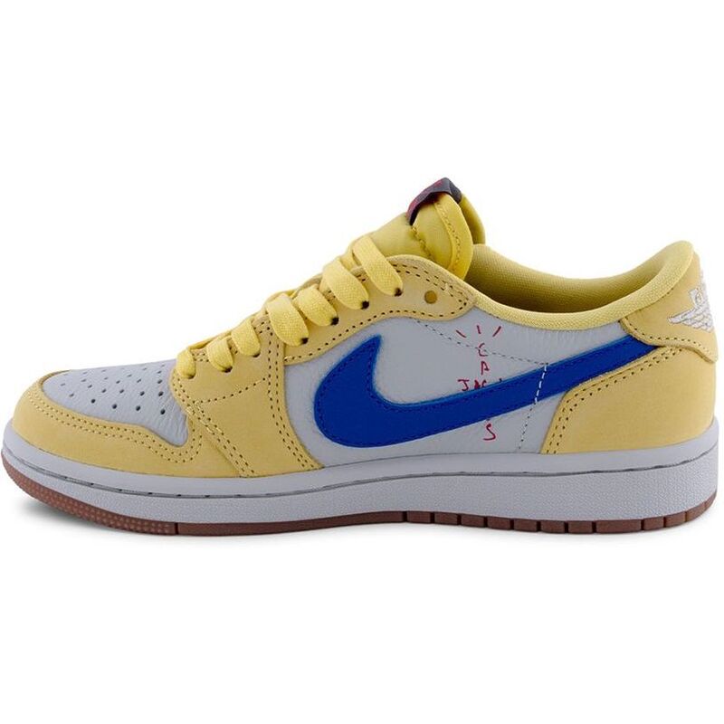 These sneakers feature the rapper’s signature reverse Swoosh in Racer Blue on the side, with white leather upper contrasted by yellow forefoot and heel overlays. A red and black Nike Air tag graces the tongue, with mismatched Cactus Jack and Jordan Wings branding embroidered on the heels.
