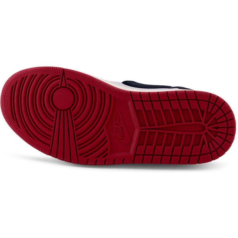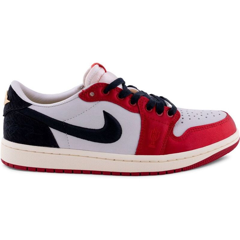 REF: FN0432100 - These sneakers offer a luxurious twist on the classic ‘Black Toe’ AJ1. The white leather upper features a black embroidered Swoosh and a red satiny textile forefoot overlay with a tonal Trophy Room logo, with a woven Nike tag and a metallic gold Wings logo. The vintage off-white midsole sits elegantly atop a crimson rubber outsole.