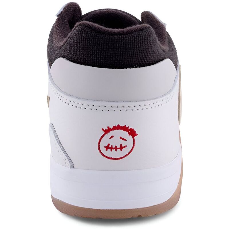These sneakers feature Scott's debut signature sneakers in black canvas with off-white tumbled leather overlays and a matching midfoot strap, with the red Jumpman logo complementing the backward suede Swoosh on the side. The Cactus Jack face logo adorns the heel, with 'Jack' inscribed in oversized red letters on the cream rubber outsole.