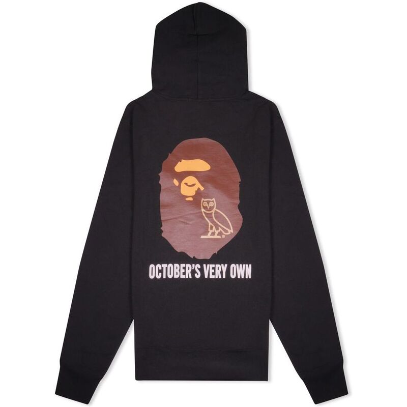 This hoodie showcases an elegant white "October's Very Own" logo on the front, complemented by a white ® logo at the bottom of the pocket. The back features the bold brown BAPE and owl logos, alongside a stylish white "October's Very Own" logo, all beautifully set against a sleek black backdrop.
