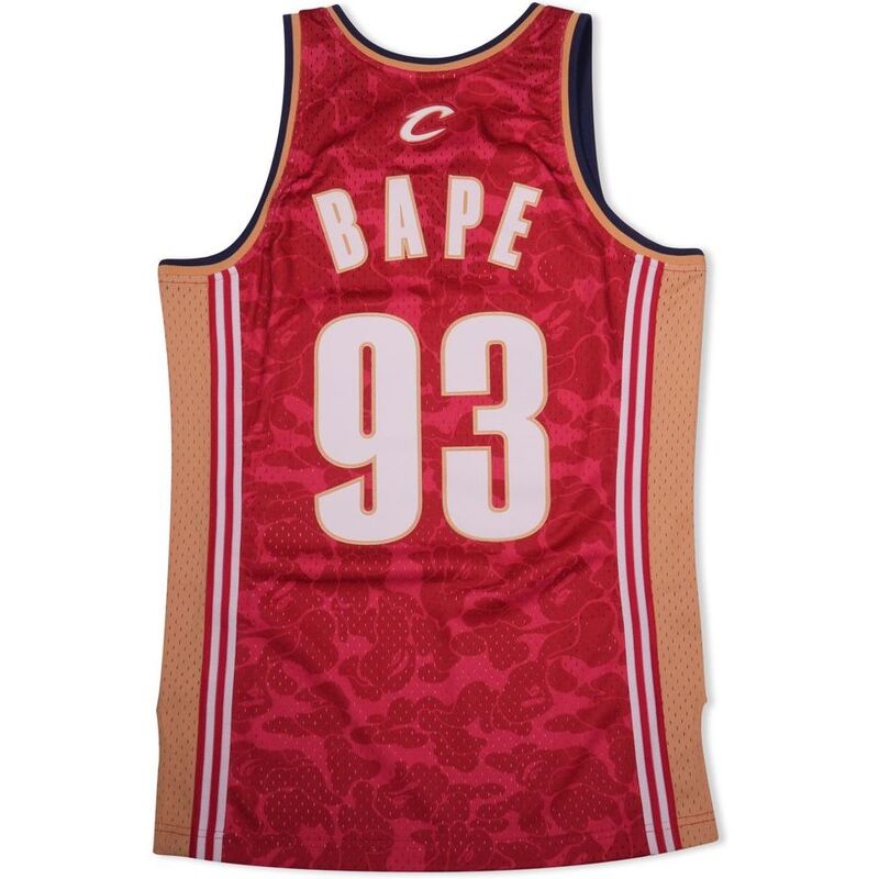 This basketball jersey features the Cleveland Cavaliers’ signature burgundy color. The front showcases the team name and logo, while the back displays the team and BAPE logos with the number 93 in white, all subtly framed in beige, adding a refined touch that complements the jersey's sides.