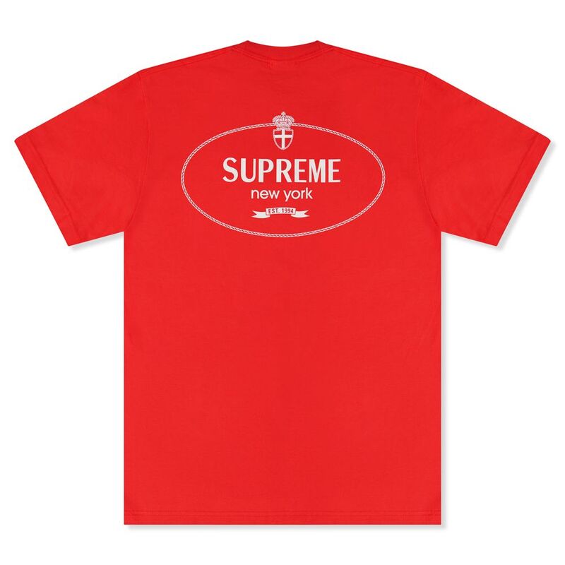 The Supreme Crest Tee in red features a bold crest graphic, with a crowned "SUPREME" wordmark arched above a striped banner that reads "New York" and "EST. 1994." The design is enclosed in a sleek oval frame with a rope border, and the crisp white print adds a striking contrast against the elegant red hue of the tee. Crafted from soft cotton, it offers a relaxed fit, making it an ideal choice for everyday casual wear.