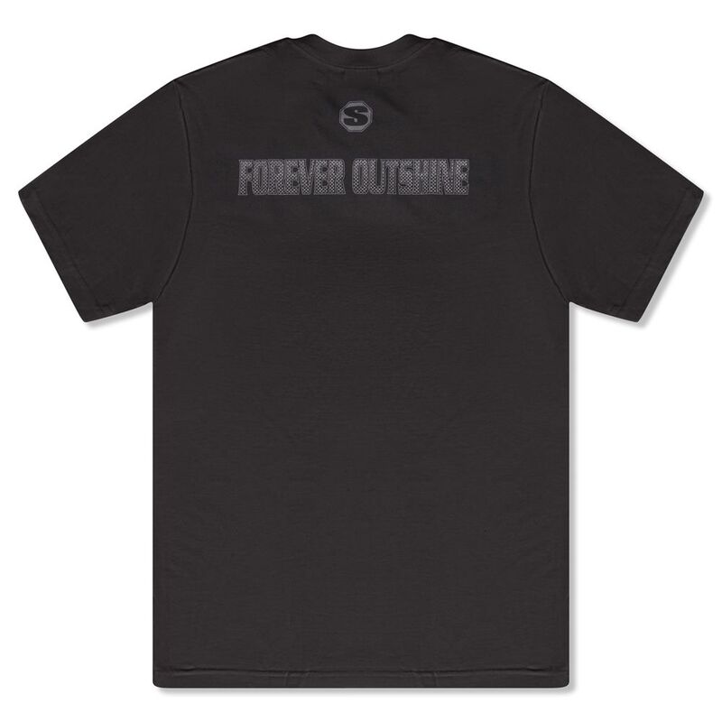 The Supreme Blockbuster Tee in black offers a playful take on the brand's iconic "S" logo in grey, with a stylized octagonal border and bold, shadowed lettering. Beneath the "S" emblem, the word "Supreme" is subtly incorporated. The back of the tee features the "S" logo, with the tagline "FOREVER OUTSHINED" boldly emblazoned below.