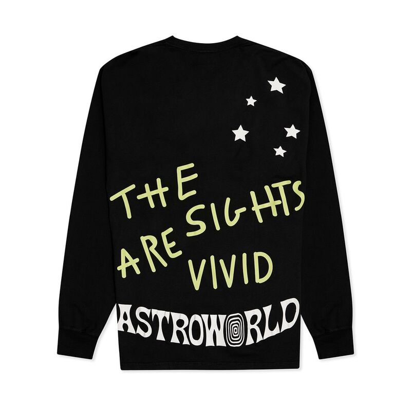 This Enjoy The Ride L/S T-Shirt, made from premium cotton fabric, features a sleek black backdrop, showcasing a bold graphic of a skeleton riding a horse on the front with the words "Enjoy the Ride". The back features five white stars with the words "The Sights are Vivid" above the iconic Astroworld logo.
