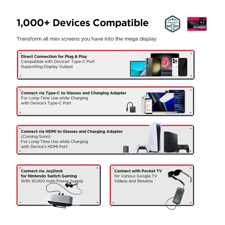 - Mini to Mega Transformation: Convert any device into a huge screen. Plug your phone, tablet, or laptop directly into RayNeo glasses and enjoy a cinematic display. Perfect for gaming, movies, or productivity, whether at home or on the go.