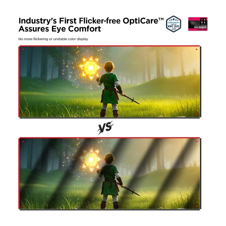 - Rest-Assured OptiCare™: OptiCare™ enhances eye comfort with 3840 Hz DC and PWM dimming, reducing flicker and color instability. The 20 brightness levels simulate natural light in dark environments. TÜV SÜD certification ensures low blue light and flicker-free comfort for long use.