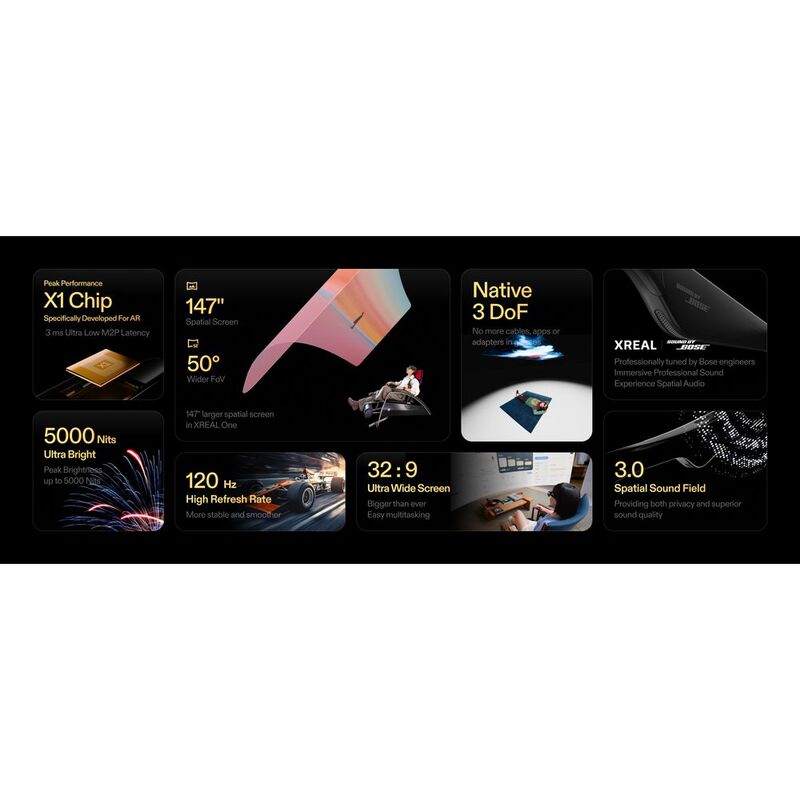 XREAL One features a 0.68'' Sony Micro-OLED display and a proprietary optics engine. Massive virtual screen size of up to 147" (equivalent to a projection from a 4-meter distance), with a 50° FOV, peak brightness 5000 nits, perceived brightness 600 nits, enjoy industry-leading visuals.