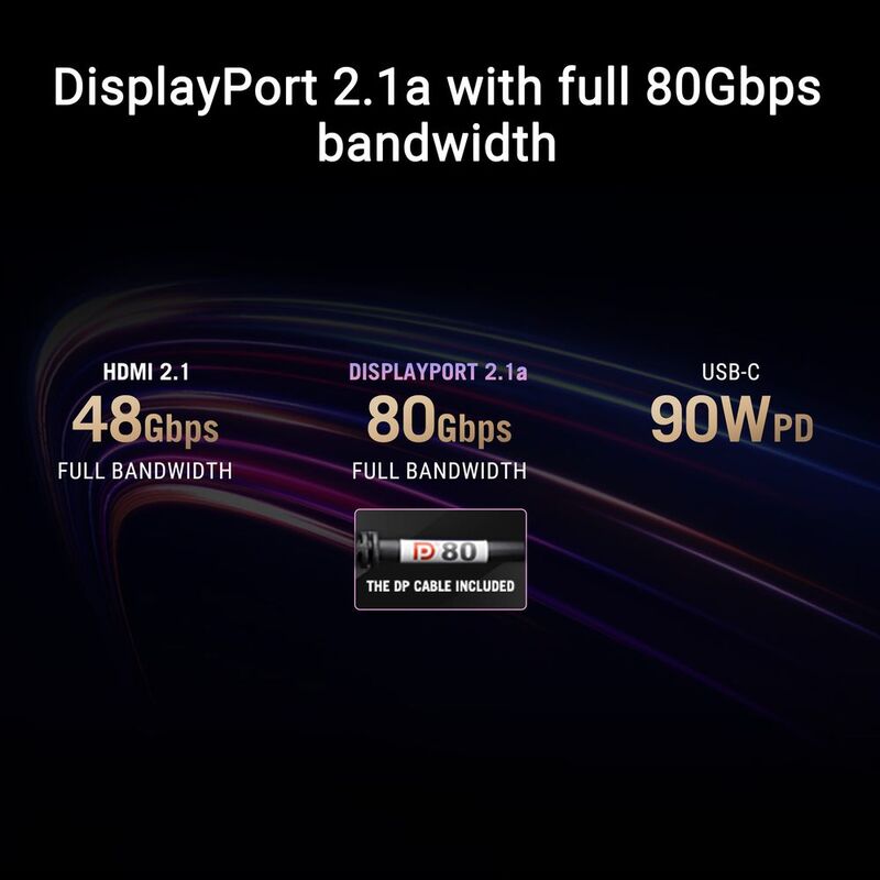 • Extensive connectivity options include DisplayPort™ 2.1a UHBR20 with full 80Gbps bandwidth, USB-C® (90W PD), HDMI® 2.1, and a tripod socket