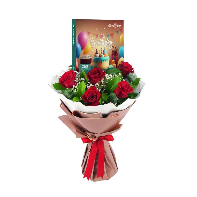 Celebrate birthdays with a touch of elegance and excitement. This deluxe gift set features a stunning bouquet of fresh red roses and an exclusive Wondergifts box with 250 unforgettable experiences. From gourmet dining and thrilling adventures to relaxing spa days, this gift set offers something for everyone. Perfect for making birthdays truly special and memorable.
