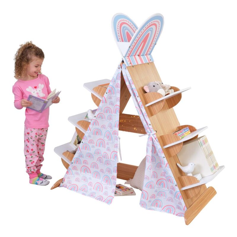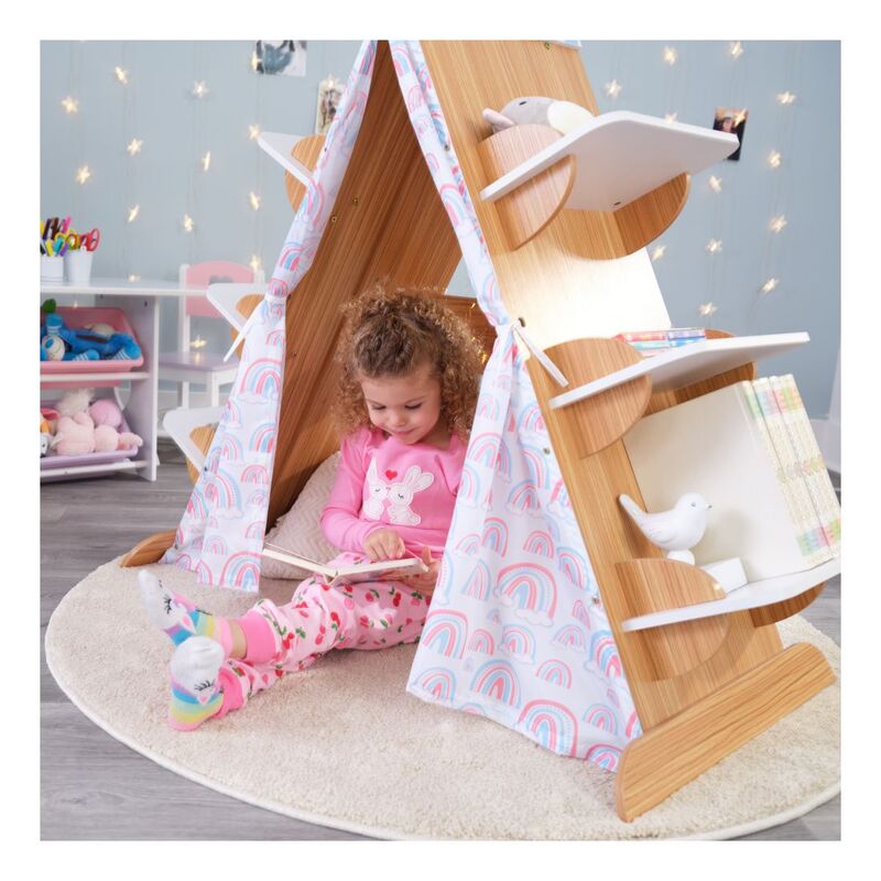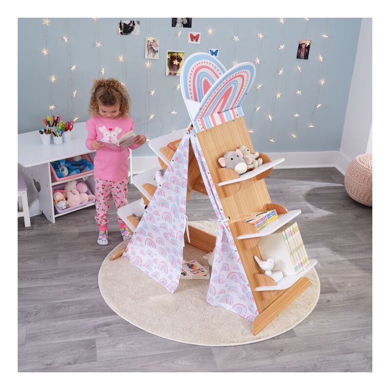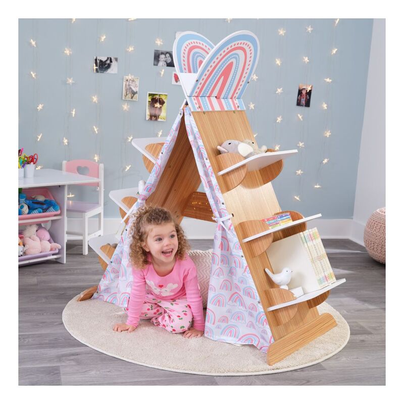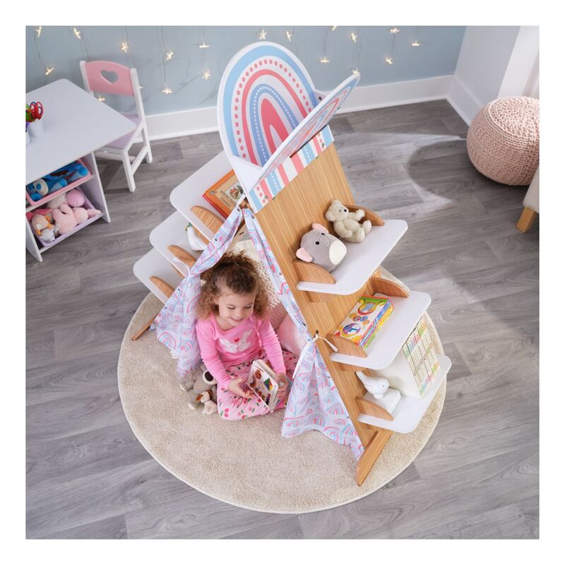 The KidKraft Book Nook Tent with Shelves provides a playful place for both holding books and reading them. Its unique teepee design is not only practical, but fun too. Slanted sides provide plenty of space to hold kids' favorite reading material. Three shelves on each side have built-in bookends too to keep books from sliding off. Inside the fabric front is a quaint area for kids to read, nap or just have quiet play time. Tie back the curtains on each side to provide some additional light. With the sturdy wood construction, parents will be thrilled to finally have a bookshelf that's as adorable as it is functional.