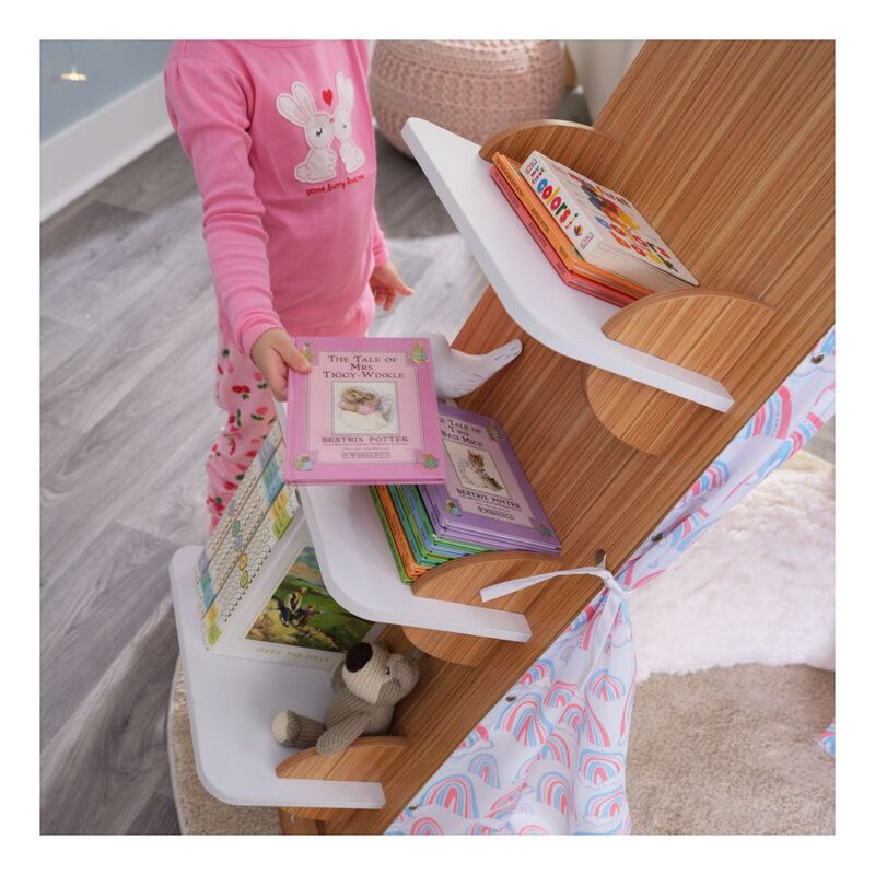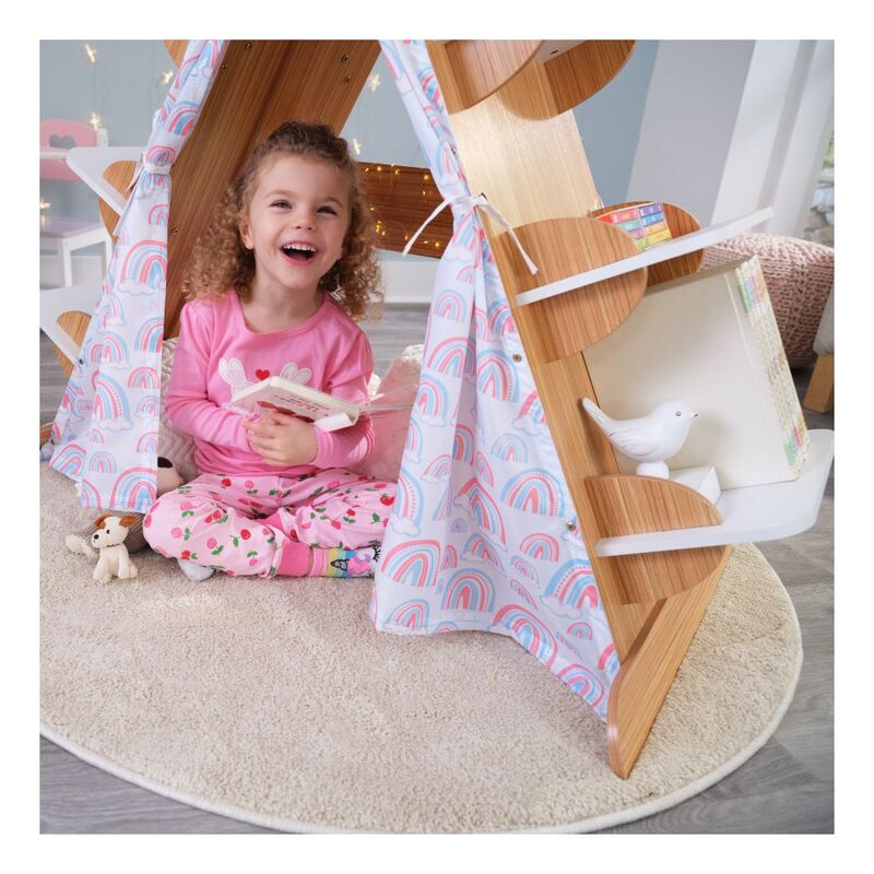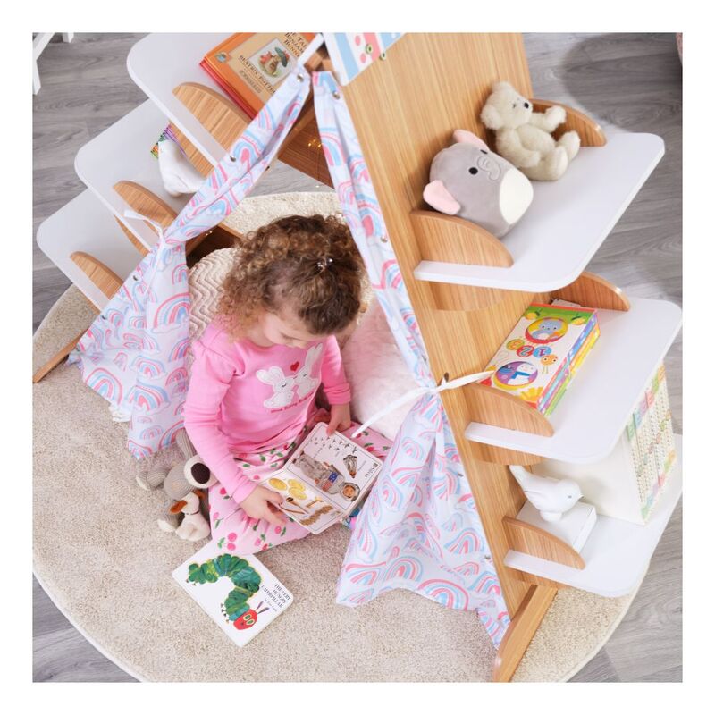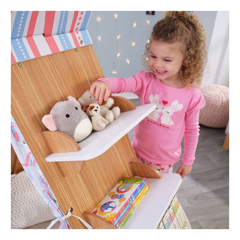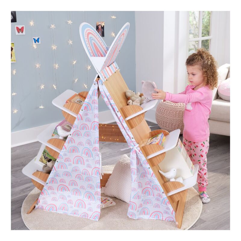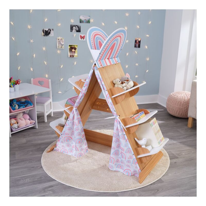The KidKraft Book Nook Tent with Shelves provides a playful place for both holding books and reading them. Its unique teepee design is not only practical, but fun too. Slanted sides provide plenty of space to hold kids' favorite reading material. Three shelves on each side have built-in bookends too to keep books from sliding off. Inside the fabric front is a quaint area for kids to read, nap or just have quiet play time. Tie back the curtains on each side to provide some additional light. With the sturdy wood construction, parents will be thrilled to finally have a bookshelf that's as adorable as it is functional.