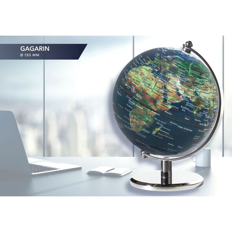 GAGARIN is a mini globe in a classic design that rests firmly on a high-quality heavy metal frame. Optionally, there is the 130 x 170 millimeters large globe with a chromed metal base and with a glossy globe or alternatively with a black matt metal base and with a matt globe. Due to the central axis, our planet is easy to see from all sides. The listed countries and cities are presented in English.