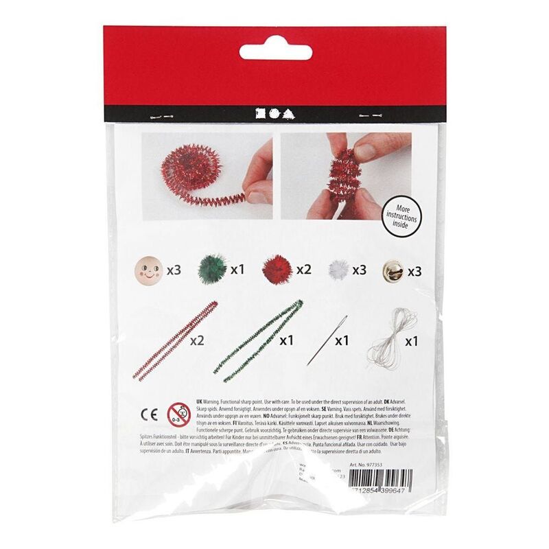 Metal chenille, metal pom poms, cotton wool heads, bells, needle and string for hanging