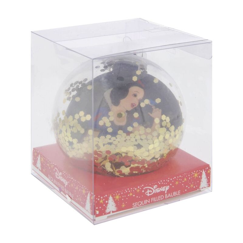 Bring the magic and glamour of the Disney princesses to the festivity with this wonderful 7.5cm gold Snow White sequin bauble.The round glass bauble features an iconic central Snow White print surrounded by beautiful shimmering golden sequins. The bauble includes a silver glitter hanging ribbon. Complete with a branded gift box, this makes a wonderful gift to any Disney lover. Collect the entire set of princesses and make one magical Christmas tree.