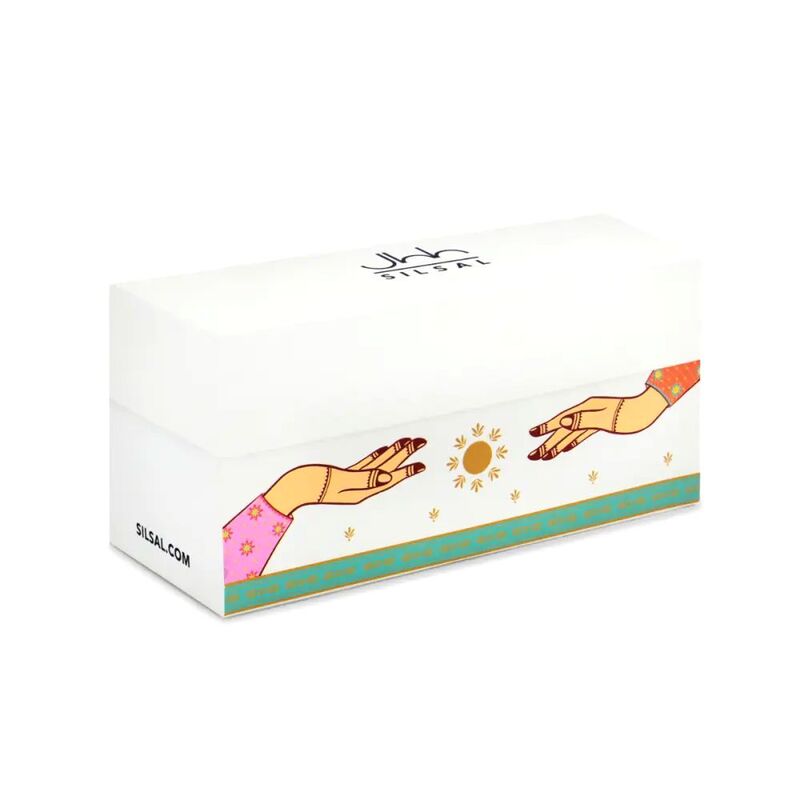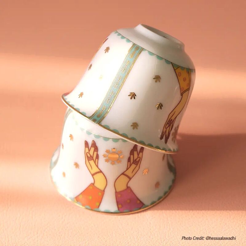 Indulge in the exquisite craftsmanship of the Hessa Arabic coffee cups. Meticulously crafted from porcelain, these captivating pieces are adorned with enchanting designs inspired by the art of Hessa. A remarkable collaboration between Emirati designer Hessa Al Awadhi and Silsal, the Hessa collection is a tribute to Emirati Women's Day.