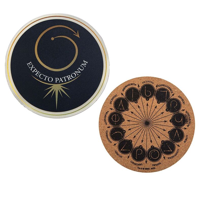 This coaster set includes four unique designs, each showcasing a different spell or charm, including "Expecto Patronum", "Expelliarmus", "Stupefy", and "Salvio Hexia". These coasters are designed to protect surfaces from unsightly water rings and scratches.
