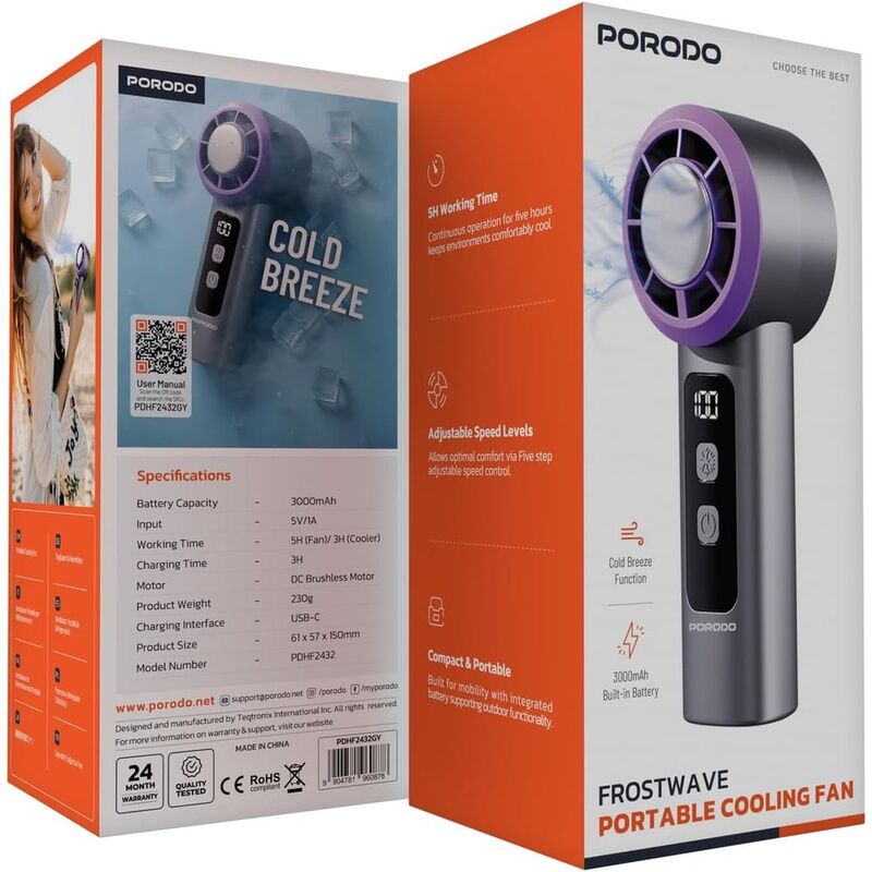 Cold Breeze Function: Delivers a refreshing cold breeze to cool you down on hot days. DC Brushless Motor: Quiet and efficient operation for a smooth and comfortable experience. High Efficiency Battery: 3000mAh rechargeable battery provides up to 5 hours of use. Adjustable Speed Level: Choose the perfect speed level for personalized cooling. LED Display: Easy-to-read LED display for monitoring fan speed and battery life. What You Get: The package includes Porodo Frostwave Portable Cooling Handheld Fan, 24-hour customer service, lifetime technical support, and a free 12+12 months warrenty.