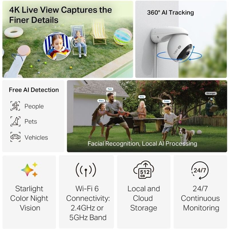 Tapo 4K cameras deliver sharper, more detailed live views, making them perfect for capturing finer details like license plates, human faces and moving objects. The camera boasts free and powerful Al that recognizes and tags strangers, family, and friends for easy identification, reducing overall notifications to the ones that matter. All facial data is processed locally without cloud uploads, ensuring privacy and security. Set a custom schedule for the camera to automatically scan a full 360degrees and record or define specific viewpoints that it will visit at designated times. Enjoy colorful images in low-light conditions with spotlights and a starlight sensor.