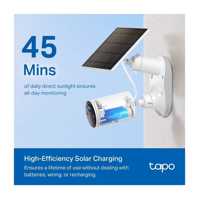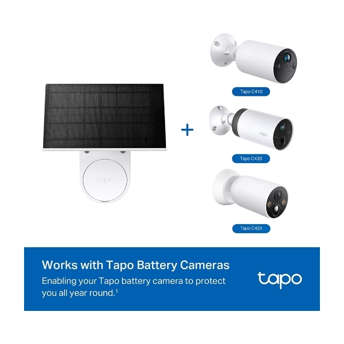 - Works with Tapo Battery Cameras:Compatible with all Tapo Battery Cameras1, enabling your Tapo battery camera to protect you all year round.
