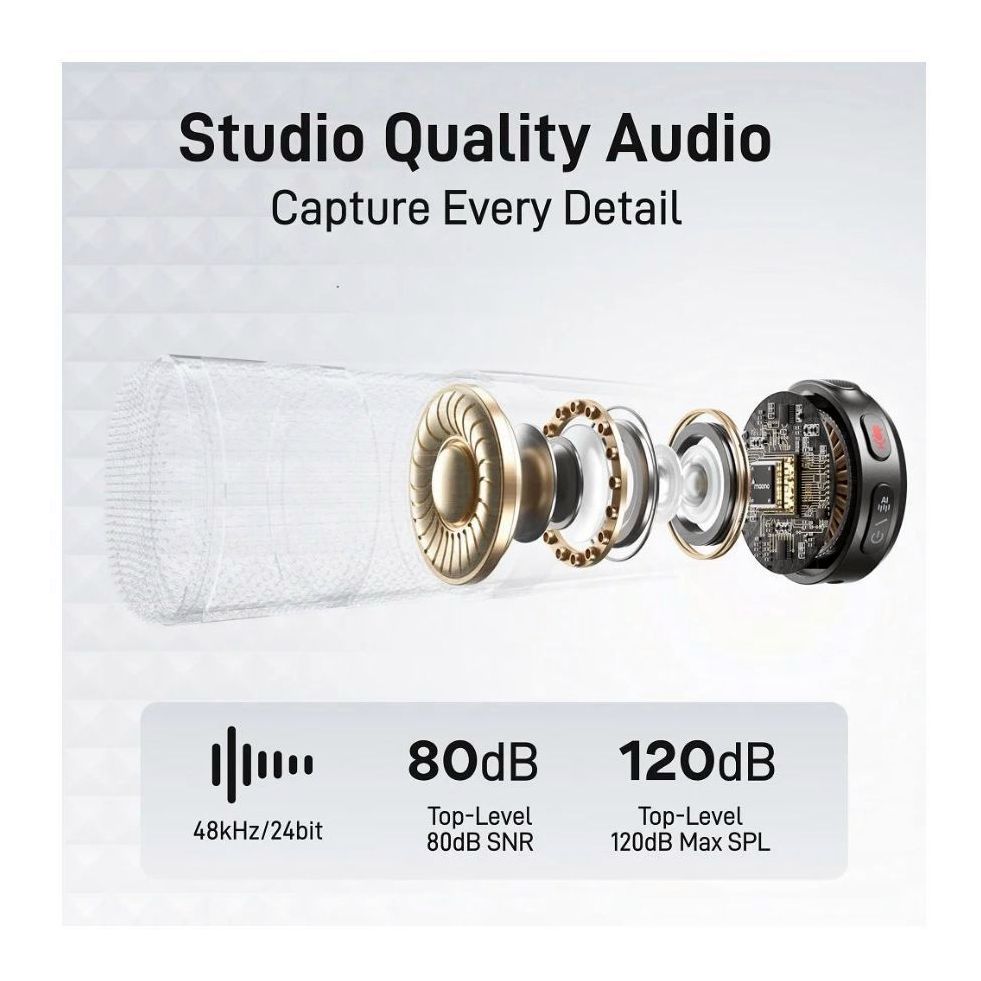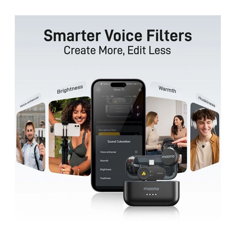 The Maono WAVE T5 is an ultra-light 9g wireless microphone engineered for creators seeking studio-grade sound. Featuring 48kHz/24-bit resolution, 80dB SNR, and 120dB SPL, it ensures crystal-clear audio with advanced 3-mode/14-level ENC noise cancellation. Enjoy up to 30 hours of battery life with the case, 1000ft stable wireless range, plug-and-play ease, and creative voice filters via the Maono Link app. Compatible with iOS, Android, DSLR, and PCs-ideal for vlogs, films, podcasts, and live content.