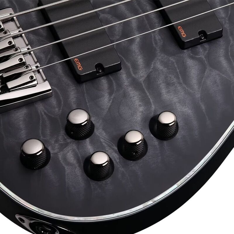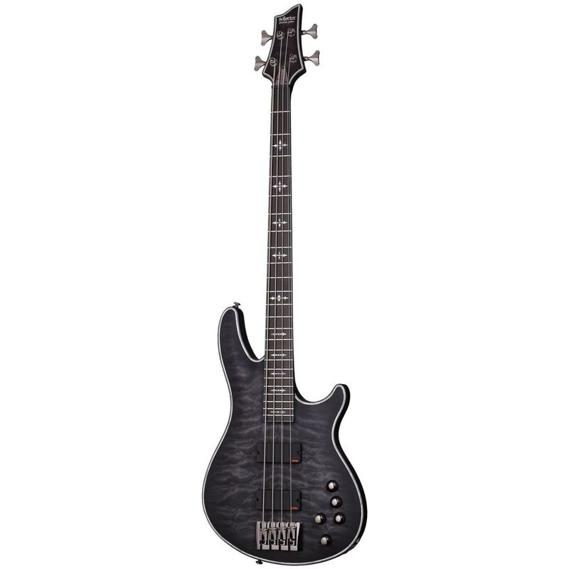 The See-Thru Black Satin finish gives it a bold and modern look, complemented by black chrome hardware for a sleek, understated appearance. The Schecter Custom Bass Bridge enhances tuning stability and sustain, while the ergonomic design ensures comfort during long performances.