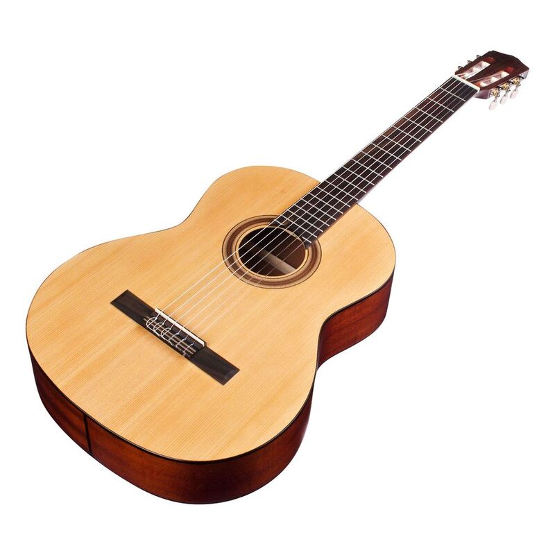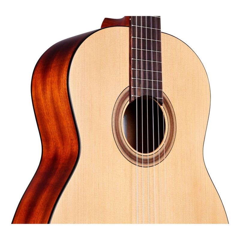 The CP100 is a complete guitar package, perfect for beginners! Included inside the box is a full size Córdoba nylon string acoustic guitar with spruce top and nyatoh back and sides, standard Córdoba gig bag, digital clip-on chromatic tuner with color display, 2 picks, and a guitar lesson book. All Córdoba guitars come with premium Savarez strings.