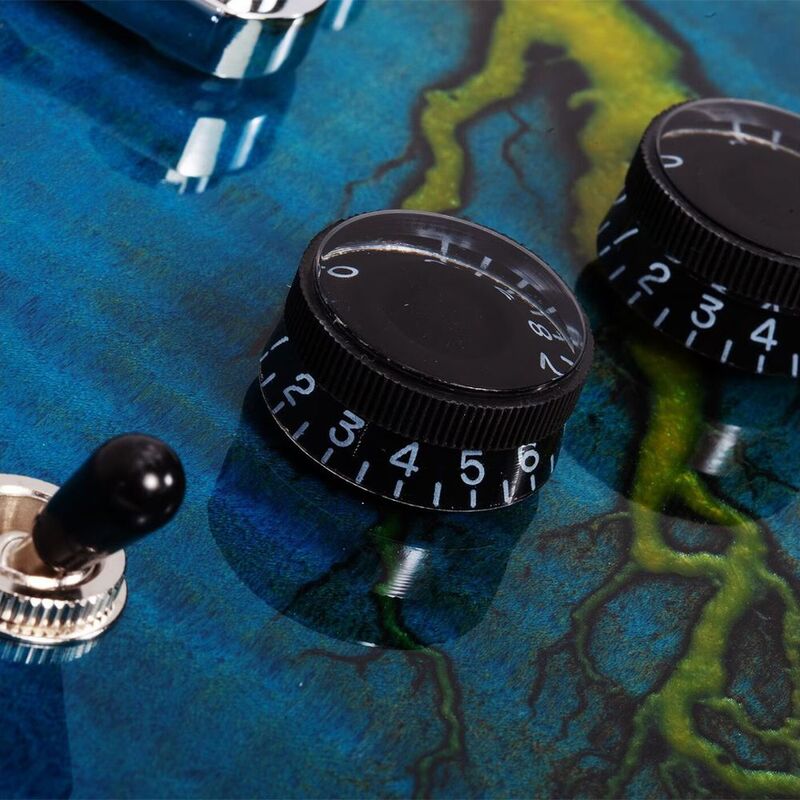Body: Mahogany body with Electro-Resin top for enhanced resonance and a unique aesthetic. The Transparent Blue finish highlights the natural grain of the wood.