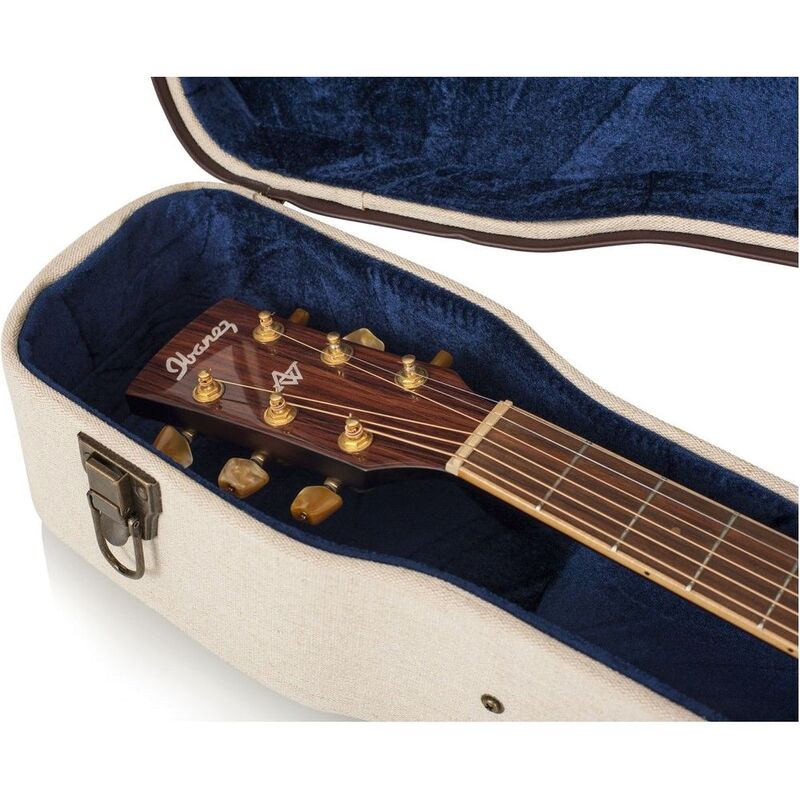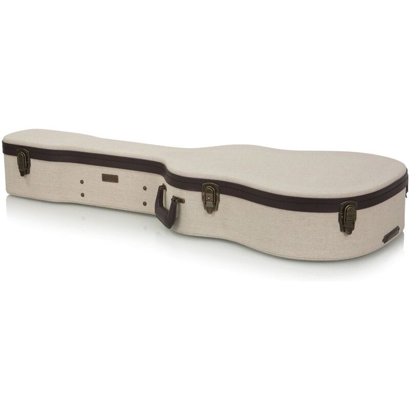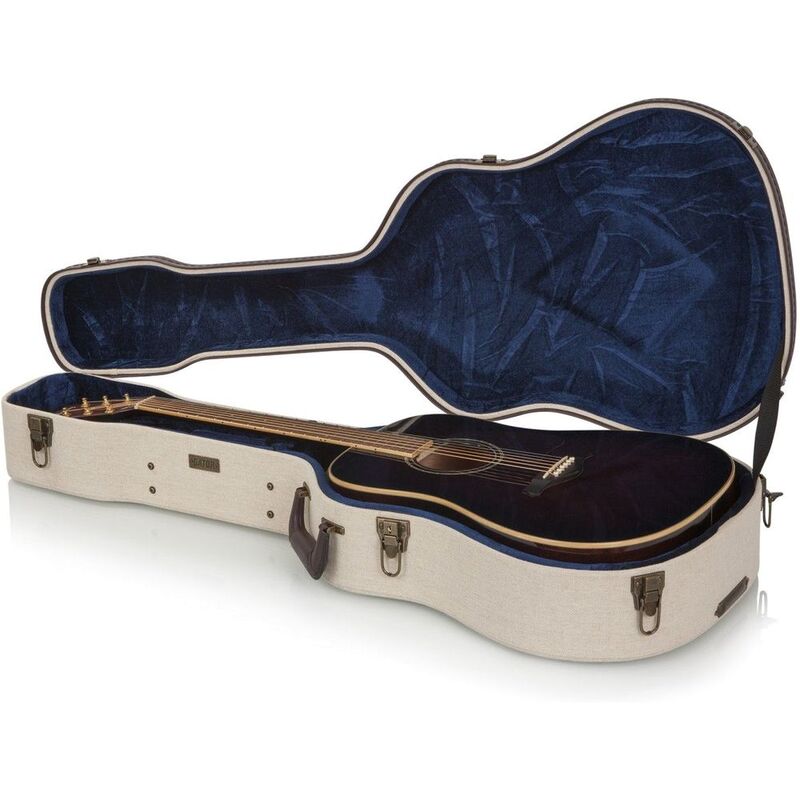 Don't trust just any guitar case, the Gator Journeyman Deluxe wood case is rugged with a vintage flare that's made to protect your acoustic dreadnought guitar. The Gator Journeyman Deluxe even looks like a 40-year-old case with its special beige-colored burlap finish and distinctive espresso-colored trim. But looks can be deceiving - since the Journeyman Deluxe's design is based on traditional guitar case construction it can handle the rigors of the road. As you know, "nothing is tougher than a Gator!" Grab a Gator Journeyman Deluxe hardshell case and know your acoustic dreadnought guitar is protected.