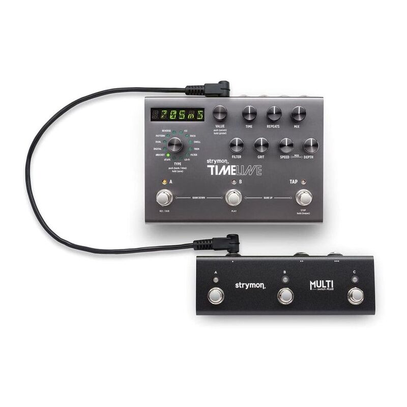 MultiSwitch Plus can be configured in several different ways to extend floor control of compatible Strymon pedals. Depending on the selected mode and the pedals connected, you can recall presets, change banks, operate TimeLine’s looper, remotely tap tempos, and more.