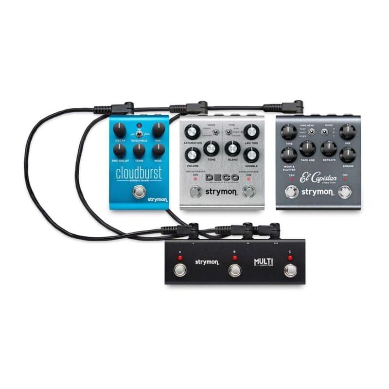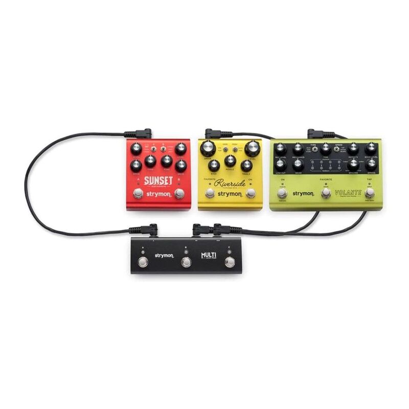 Featuring three outputs, MultiSwitch Plus allows you to connect up to three compatible Strymon pedals using additional TRS cables (sold separately). Now you can engage presets on three compatible pedals simultaneously (Compadre, Iridium, Riverside, Sunset, and Volante). Or mix and match the footswitches to set up your own custom operation—such as controlling tap tempo on your Flint, Favorite on your El Capistan, and Boost on your Riverside.