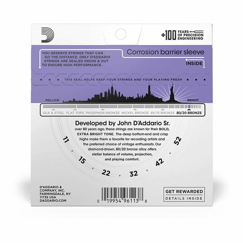 80/20 Bronze are our brightest acoustic strings, made to give your guitar an unparalleled shine. These bold sounding strings were developed by John D'Addario Sr. and guitar maker John D'Angelico in the 1930s, and have been beloved for their sparkling, trebly tone ever since. Made with a high carbon steel core and 80/20 Bronze wrap wire, 80/20 acoustic strings offer remarkable depth, along with rich, bright harmonics, and powerful projection. 11-52 Custom Light gauge strings have slightly more volume and projection than Extra Light, while still being easy to play.