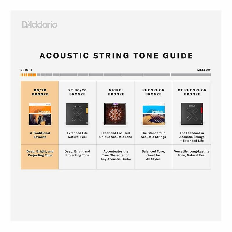• D'Addario 80/20 Bronze acoustic guitar strings are precision wound over a hexagonal high carbon steel core.