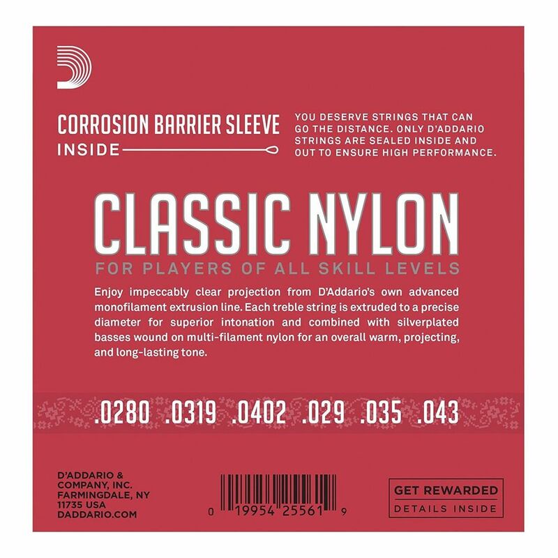 D'Addario Classic Nylon Student strings are designed specifically for beginner classical guitarists. The traditional combination of silver-plated copper wound over nylon and clear nylon trebles, brings a charmingly mellow balance, which strikes a chord with students. Classic Nylon sets are also available in smaller sizes to accommodate learner instruments. Normal Tension strings are our best-selling tension, preferred for their balance of rich tone, comfortable feel, and dynamic projection.
