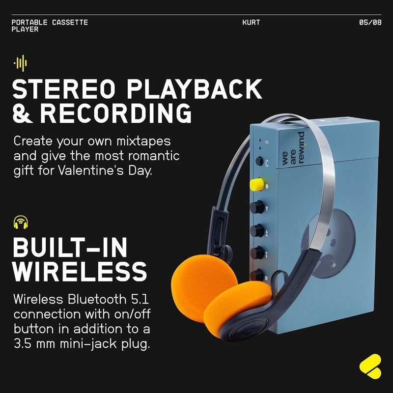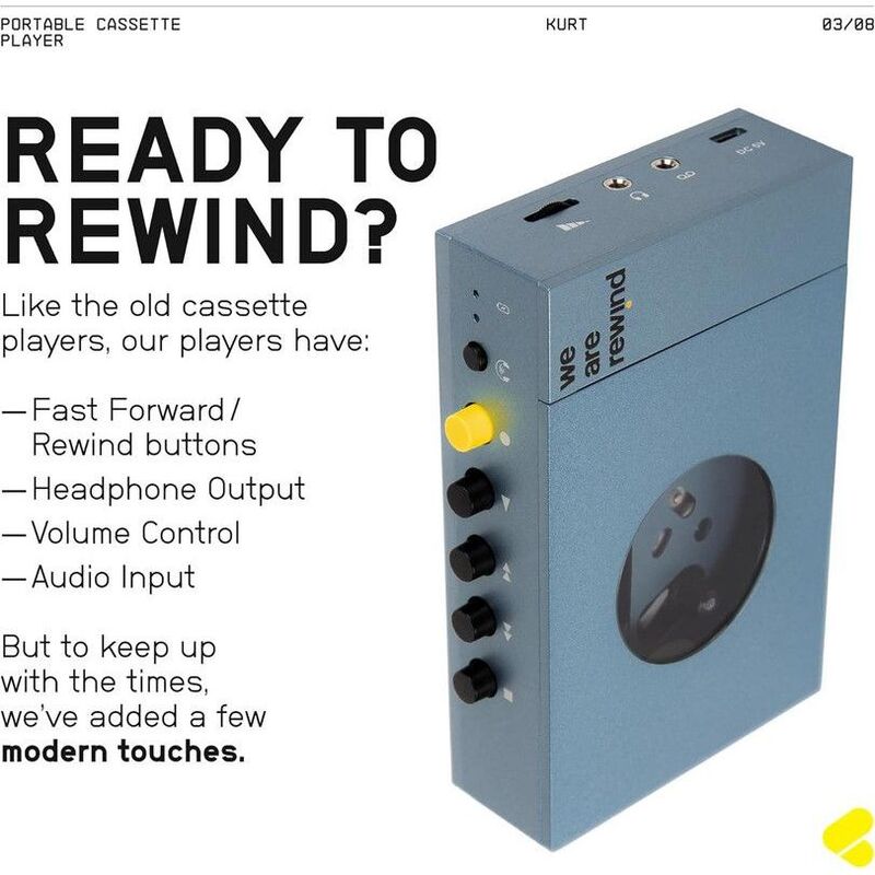 We Are Rewind is a modern walkman, with up to 12 hours rechargeable battery life, Bluetooth 5.1 transmission for your headphones or portable speaker, a 3.5mm line input for recording and a full aluminium stylish case.