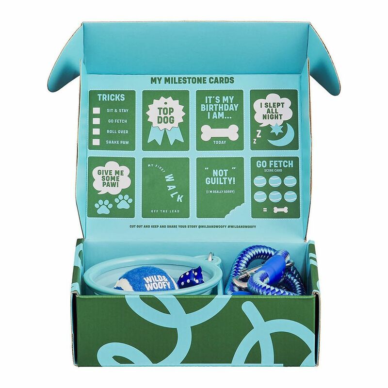 Did you say walk? Welcome your new bundle of fur to the family with this New Dog Starter Kit from Wild & Woofy! Paw-fect gift for a new dog owner! Has everything to make your new dog feel at home. Includes a bow tie, rope style lead, tennis ball and collapsible bowl with carabiner. Box measures 9inch W x 7.25inch L x 2.75inch H.