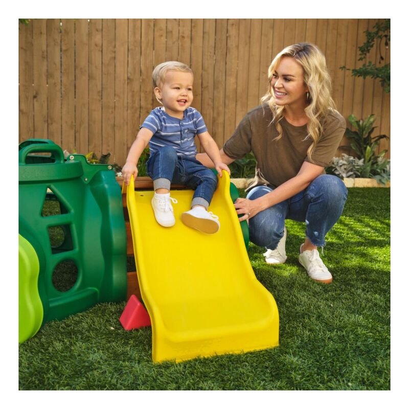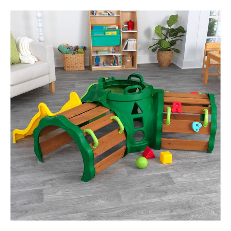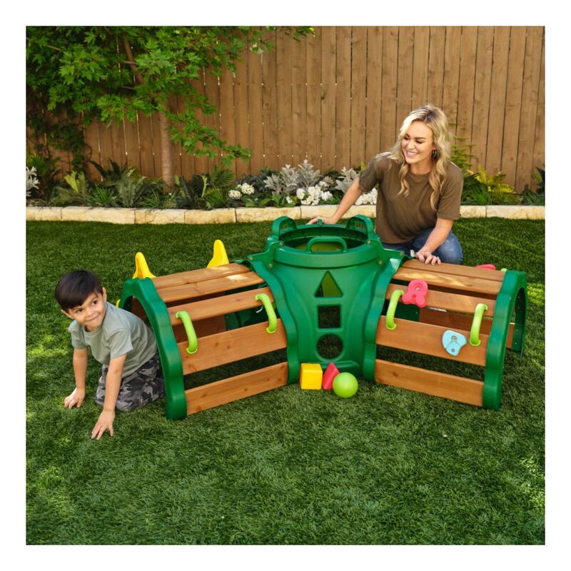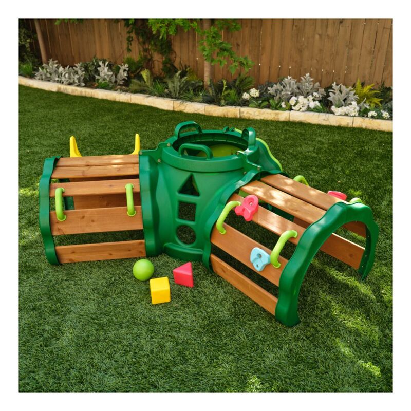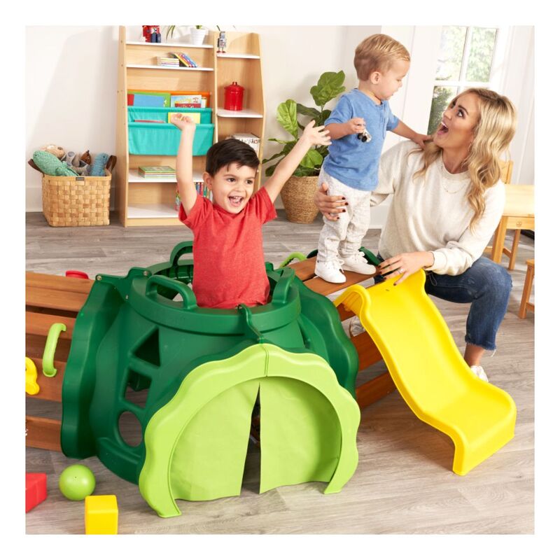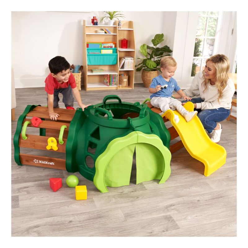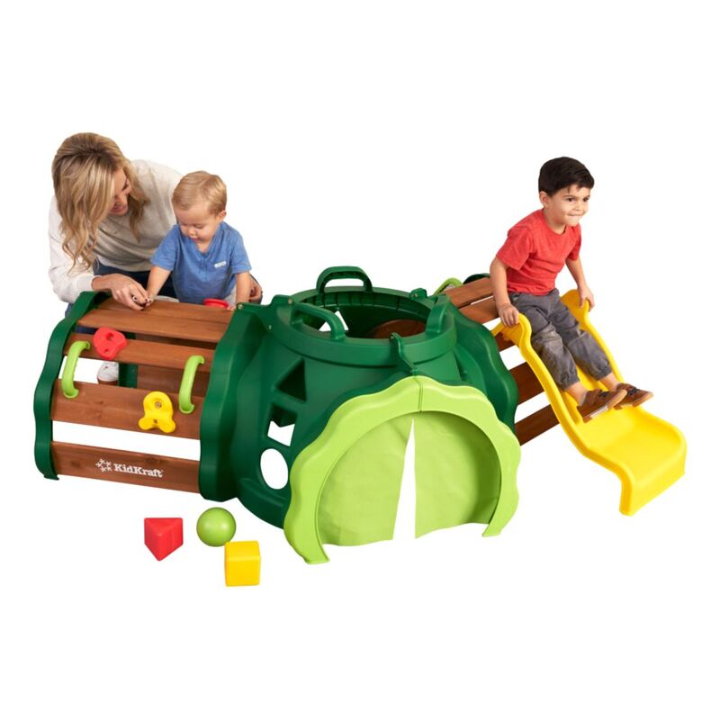 The KidKraft Hideout Hollow Tunnel Climber is like having a little bit of the playground at your very own house. The unique structure has four openings for kids to burrow their way through the easy-to-navigate maze. Flap doors are perfect peek-a-boo openings for mischievous youngsters. The top opening is a cute way for them to pop up and surprise you. There's even a just-right-sized rock wall for practicing their bouldering skills. (Handles are provided for beginners.) The opposite side includes a must-have: a slide. This one has a sloping end to help gently lower kids down to the ground. When it's time to exercise the brain and fine tune motor skills, try out the shape sorter cutouts. Three jumbo-sized shapes, just right for toddler hands, are included. Equipped to handle the outdoors as well as inside, this adventurous wood and plastic climber is ready for hours of active and imaginative play.