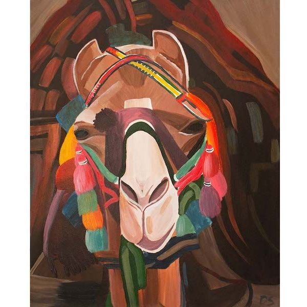 The "Camel" painting offers a sophisticated depiction of this iconic animal, enhanced by vibrant, colourful tassels that introduce cultural richness. With bold hues and intricate details, it showcases a modern artistic approach while honouring Middle Eastern traditions.