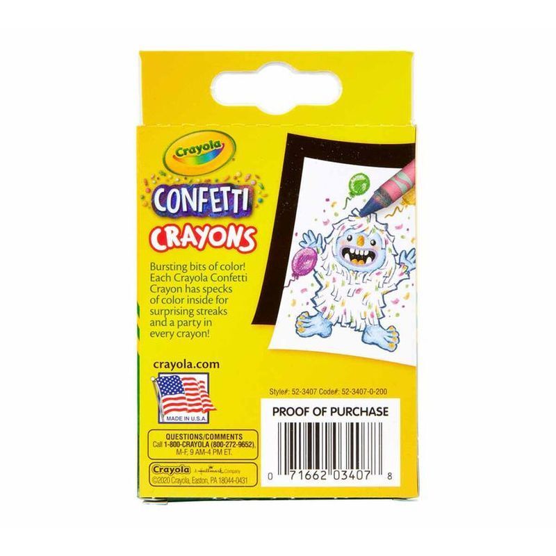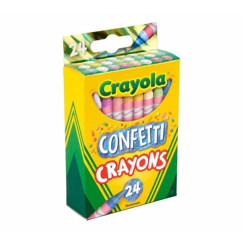 Crayola Confetti Crayons combine bits of color inside a solid crayon for a unique streaky laydown. Great for arts and crafts, coloring books or other creative fun! Features 24 Confetti Crayons, double wrapped for extra strength. Perfect for kids ages 4 and up.