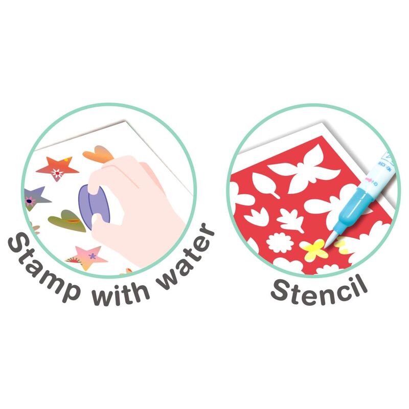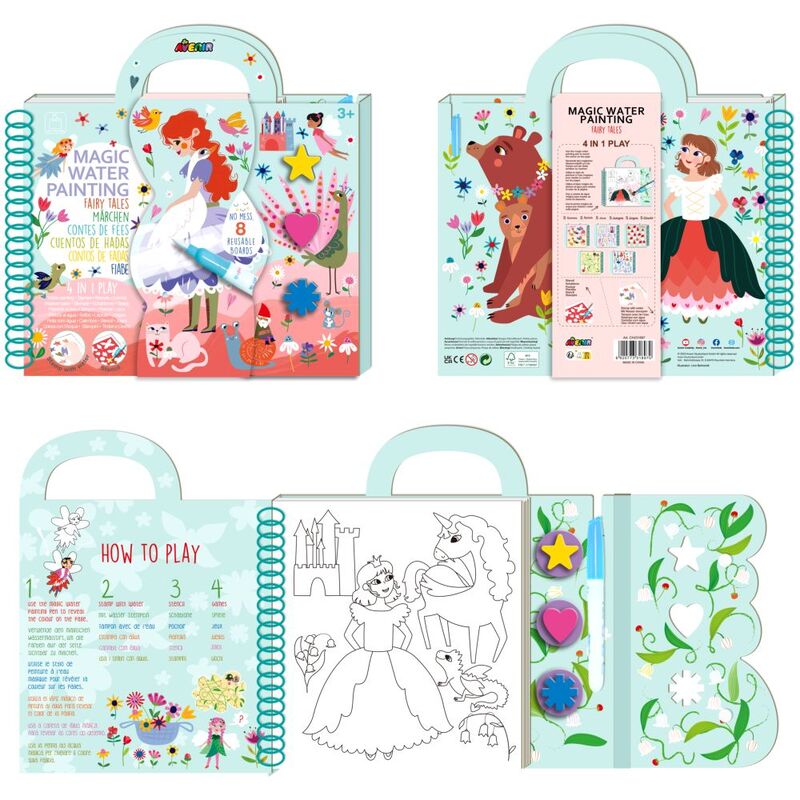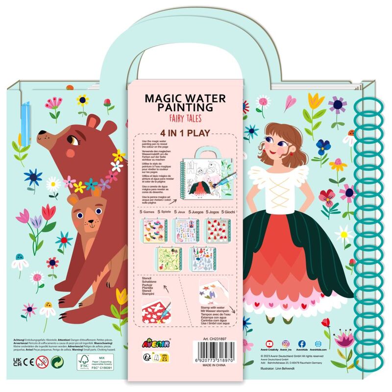 The Magic Water Painting - Fairy Tales Book comes with 8 magic water painting pages, a refillable water pen, a reusable stencil and 3 stamps. There are also some fun games too! Multiple fun activities contained in one book!