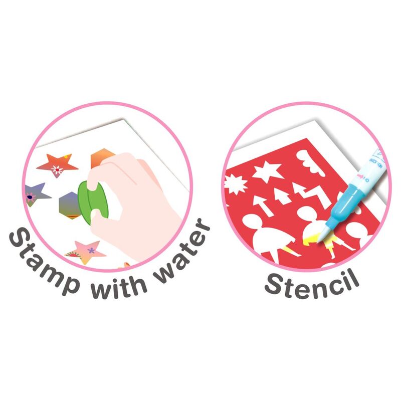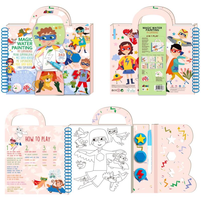 The Magic Water Painting - Super Hero Book comes with 8 magic water painting pages, a refillable water pen, a reusable stencil and 3 stamps. There are also some fun games too! Multiple fun activities contained in one book!