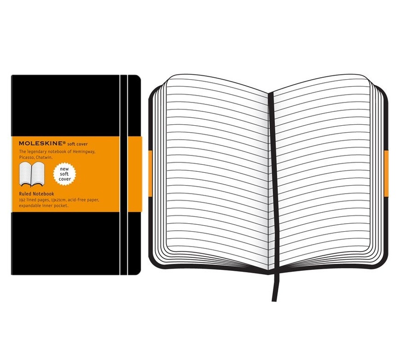 The Soft Cover large notebook with ruled pages has a flexible yet sturdy cover that adapts to the movements of the body and fits comfortably in any pocket. This is a reliable travel companion, perfect for writings, thoughts and passing notes. Every Moleskine product is thread bound and has a soft cover with rounded corners, acid free paper, a bookmark, an elastic closure and an expandable inner pocket that contains the Moleskine history.